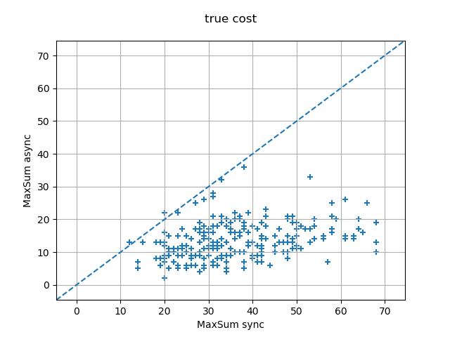 - In Max-Sum async, a performance improvement has been implemented following which a node in the factor graph does not respond to a received message if it has not changed since the last message received from the same neighbor, since this would result in the same response. This performance improvement cannot be implemented for Max-Sum sync, since each node in the factor graph needs to wait for 1 message from each of its neighbors before it can complete its iteration. This should result in Max-Sum async exchanging fewer messages than Max-Sum sync.