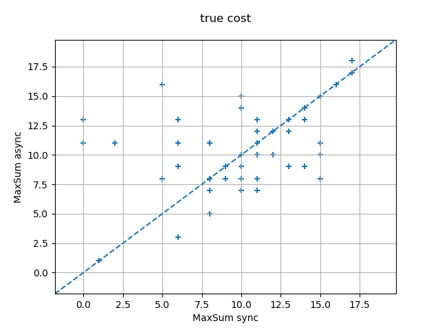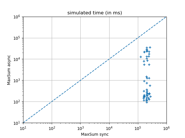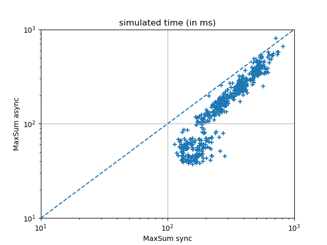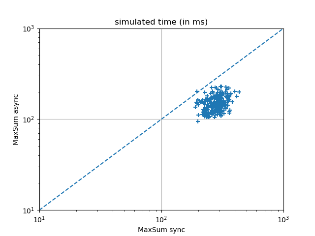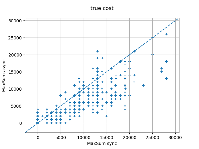 - Max-Sum now supports synchronous, round-based execution (in addition to asynchronous execution). Preliminary experimental results show that the asynchronous version outperforms the synchronous version on all performance metrics (see below).